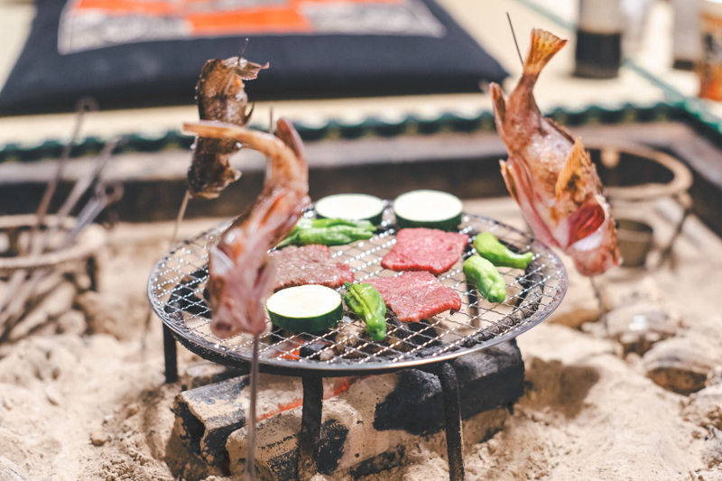 能登牛や野菜、そしてさっき釣ったカサゴを囲炉裏で焼く。テンションが上がる光景だ……。