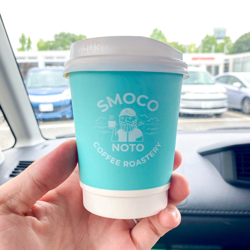 2日目に再訪した際、NOTOMORI内にある「SMOCO」のコーヒーで一服。地震で店舗が全壊し、空港で営業再開したコーヒースタンド。車で奥能登を回っていると空港は休憩地点としてちょうどよく、何回も立ち寄ることに(撮影:編集部)