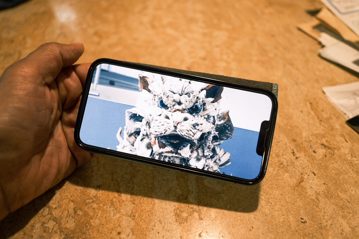見たもなにも、かっこよすぎてめっちゃ写真撮りましたよって言ったら、「あのシーサーの目は、僕が提供したヘソなんだ」って。