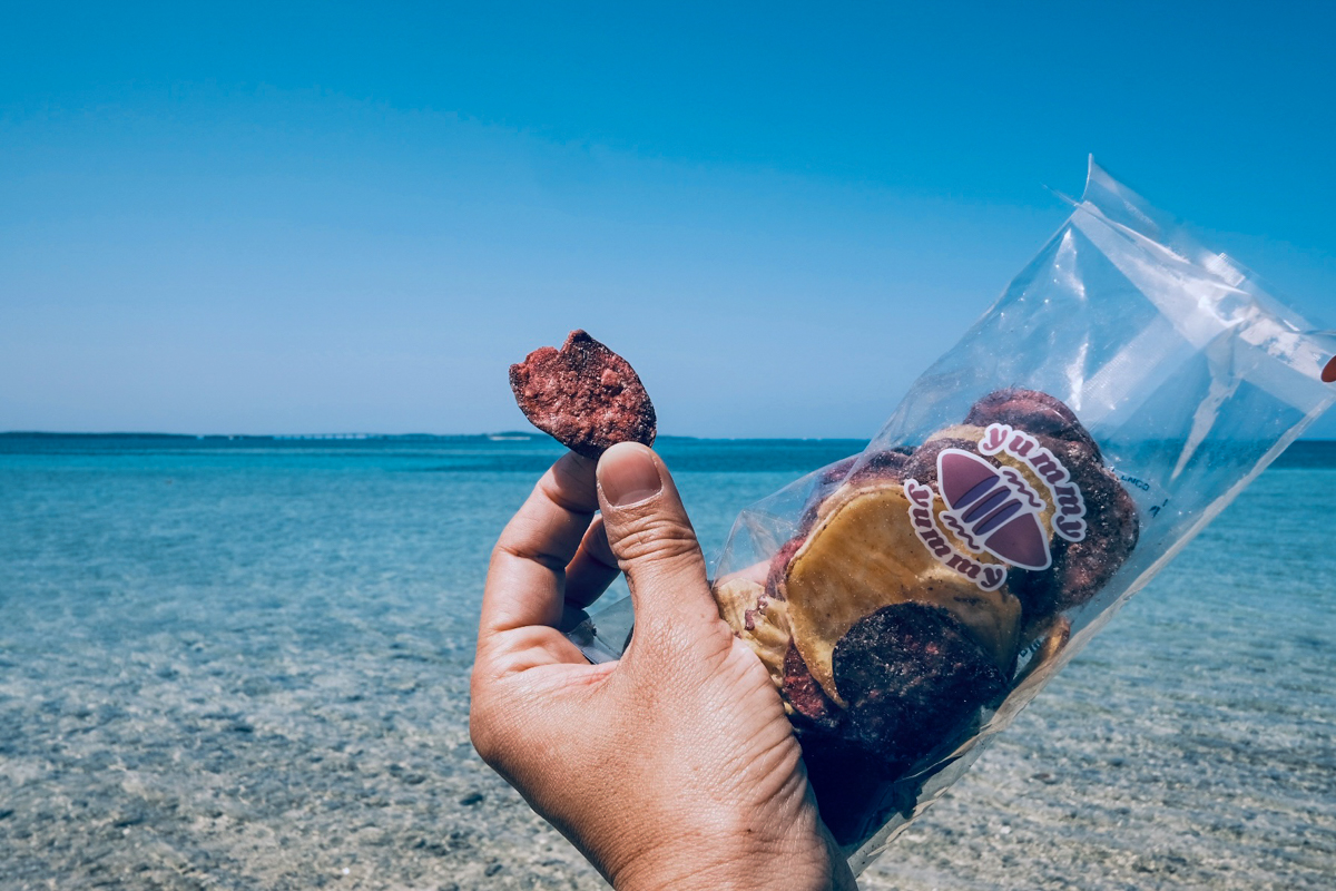 島尻購買店で買った芋のチップスを海を見ながら食べたら、これもめっちゃ美味かった。芋は何種類か入っているし、切り方も厚切りから薄切りまであるから食感が違っていて、芸が細かい。まさにヤミーでした。空港とかでも探したんだけど見つからなかったので、見つけたらすぐゲットしてみてほしいです。