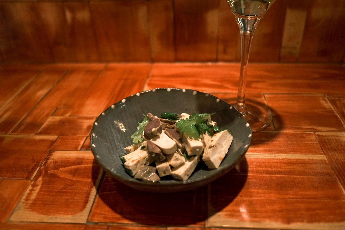 初日の3軒目は、「ガリンペイロ」。まずは豆腐と砂肝を使ったアテを白ワインでいただきました。