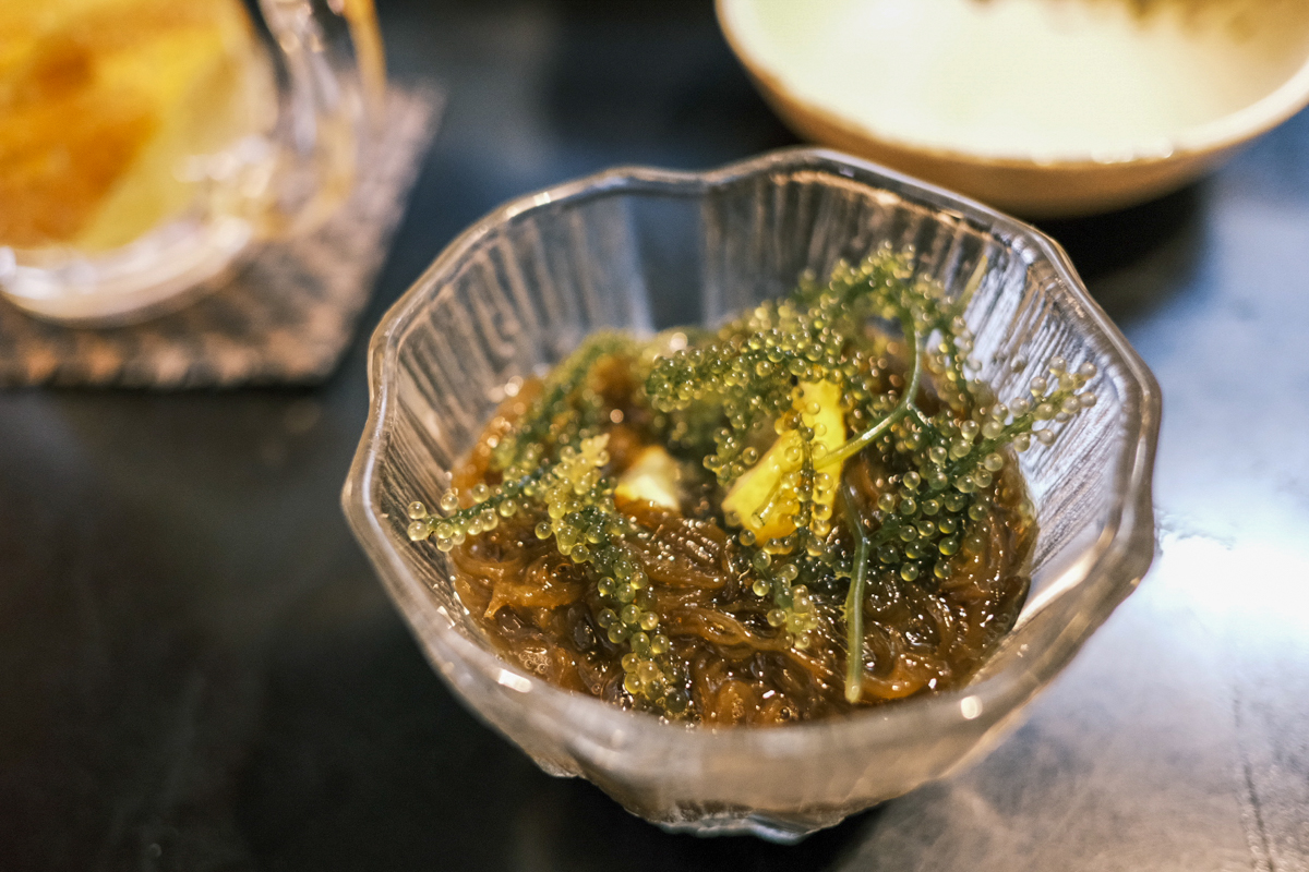 おまかせ1500円のアテは、海ぶどうのもずく酢から始まり、