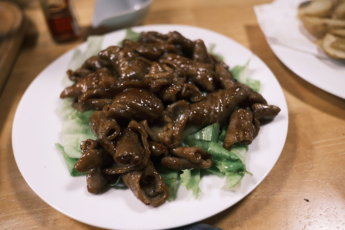 「もぢづもだれづ」という謎メニューを頼んでみたら、もつ焼き! というか、いわゆる、こてっちゃん。名前の由来は「もつ」と「たれ」の単なるダジャレとのこと。なんかいいぞ。