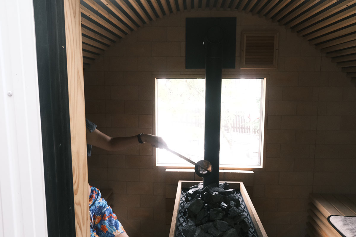 その名の通り、おむすび形のサウナ小屋は、セルフロウリュもOKで、温度と湿度バッチリ上げられます。