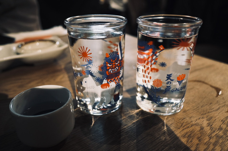 チェイサーのグラスには、僕が関わった「天の戸 のんびりオリジナル純米酒カップ」が使われていました。秋田県発行のフリーペーパー『のんびり』と秋田・横手市の浅舞酒造さんがコラボして、イラストレーターの福田利之さんがデザインしたもの。まさにこんな風に使って欲しいなと思っていたので、うれしかったなあ