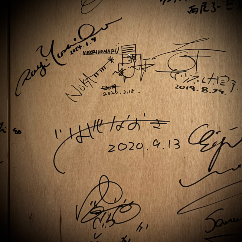 店内はそんなに広くないのですが、定期的に音楽ライブも行われているそう。友人のミュージシャン・早瀬直久くんや、奇妙礼太郎さんのサインも壁にありました