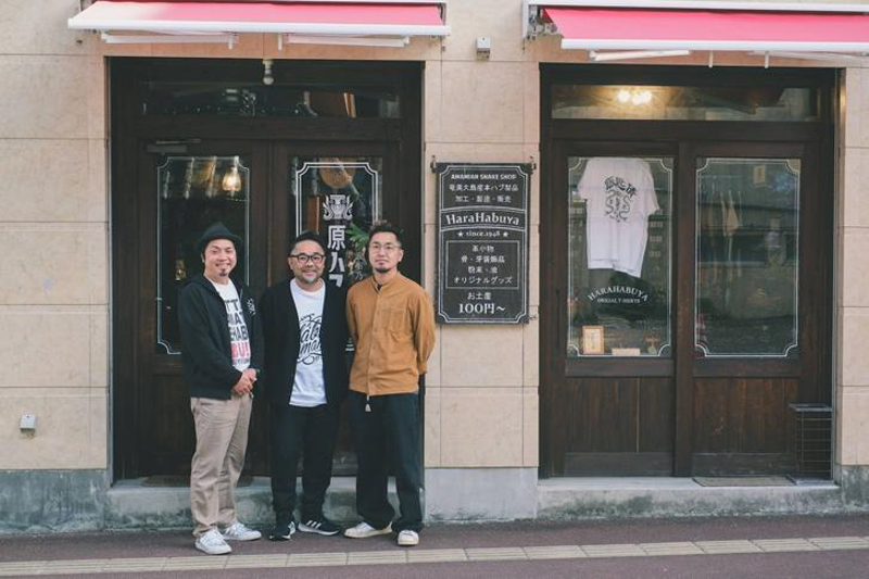 創業1948年のハブ専門店。奄美大島に生息するハブの素材を活かした製品を制作・販売するほか、ハブの展示やショーを通して、ハブの生態やハブとの共生を伝えている。 向かって左から、次男の良太さん、長男の武臣(たけおみ)さん、三男の拓哉さん。