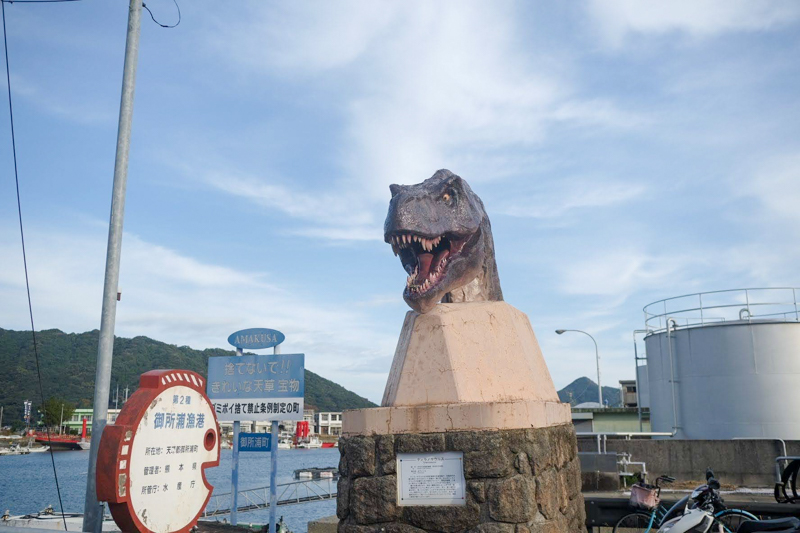 島の玄関口である御所浦港では、さっそく島のミケランジェロによる、ティラノサウルスの頭部が迎えてくれました。