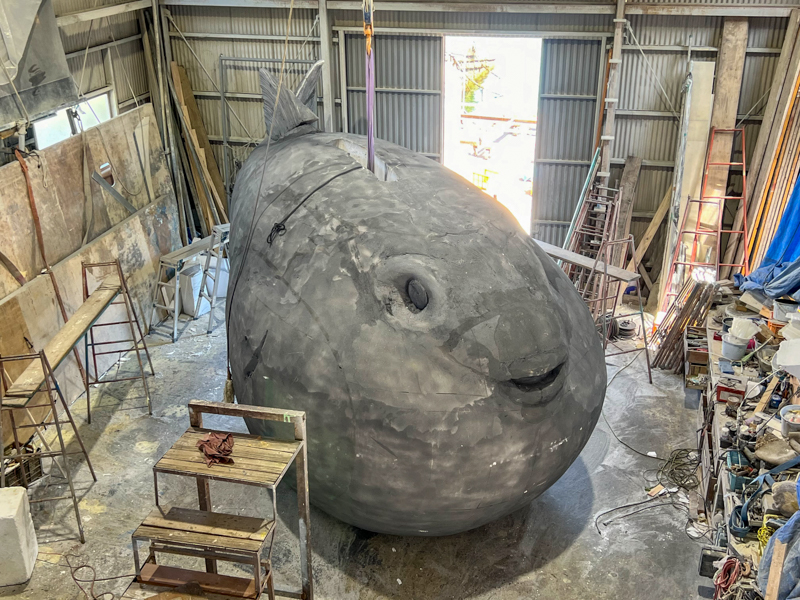 倉岳町にある全長約8m、幅約5mの無毒トラフグのモニュメント。製作期間は約3か月!