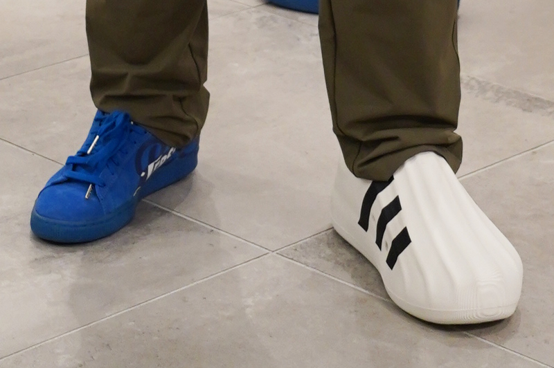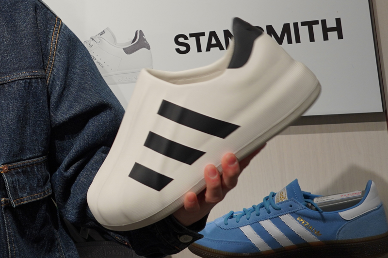 こちらはアディダスオリジナルスの「ADIFOM SST」というスリッポンですね。ぷくっとしたデザインとザラザラした素材感が個性的でしょ。アディダスの大定番「スーパースター」をモデルにしたデザインです