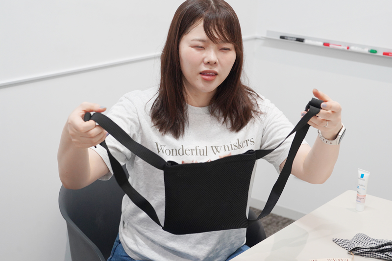 その場合は日焼け止めを塗るか、もしくは……今日は持ってきてないですけど最近はフェイスマスクしたりしてますね。『ヤケーヌ』っていうとこのやつで……以前撮った写真あるんで見ます? こんな感じです