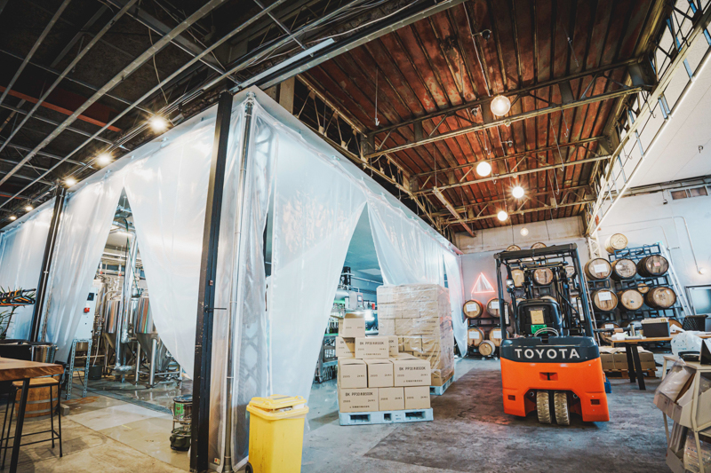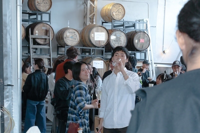 天井の高い工場跡地のなかに、醸造のための機材が並ぶエリア、木樽熟成の棚、メンバーの執務エリアに加え、手前側にはその場で買ったり飲んだりできるボトルショップが併設されている