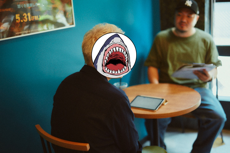 フェロー・アカデミーのラウンジで我々を出迎えてくれた翻訳者・アンゼたかしさん。サメの絵で顔は隠れていますが、渋くて優しいお方でした