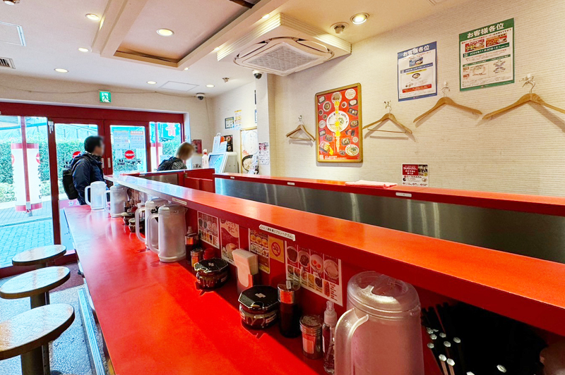 自動ドアを開けると、細長いコの字のカウンター。入口の左手にタッチパネル式の券売機があります。