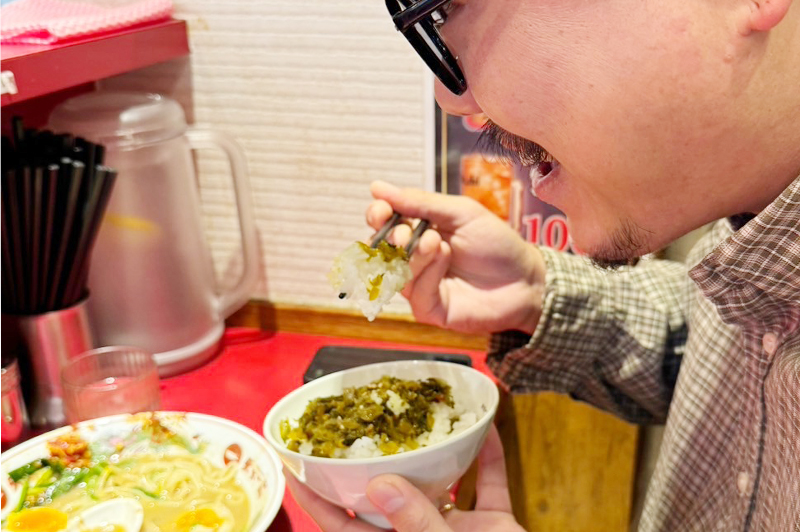 セットの高菜ごはんは、ここでしか食べられない味わい。油で炒められた香ばしさに、生姜がしっかり効いていて甘味もあり、病みつきになります。僕も毎朝中華鍋を振って仕込みをしていました。あの頃と変わらない味です。