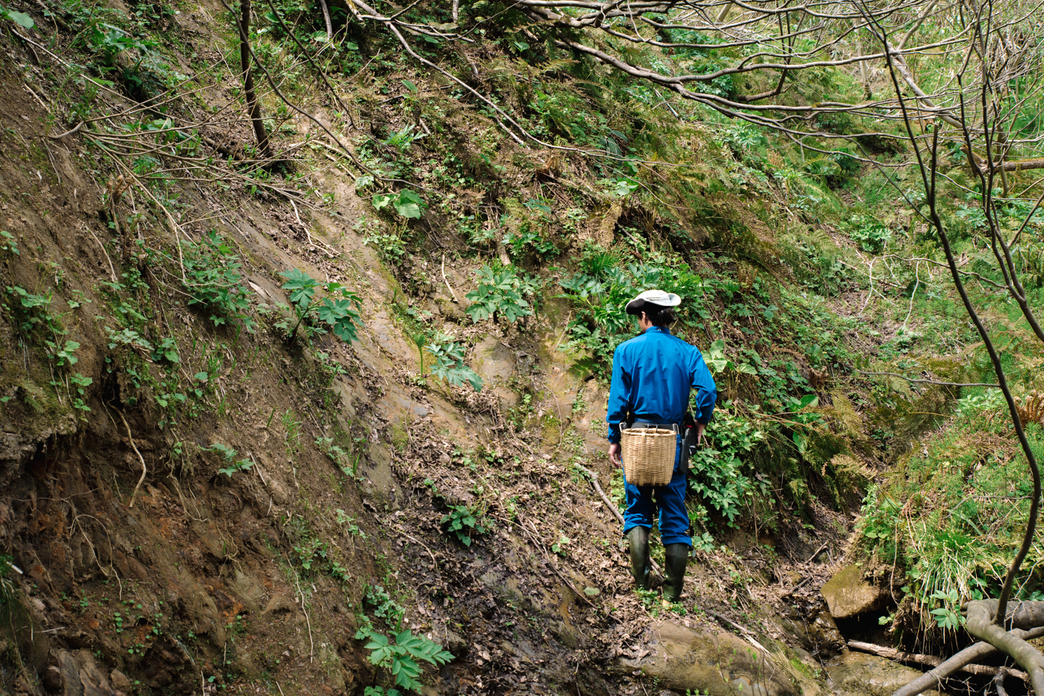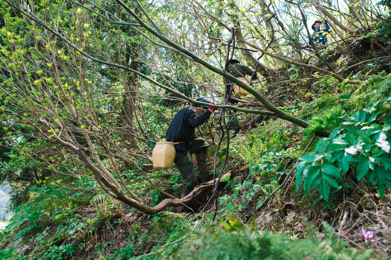 山菜採りのためならば、急な山の斜面もなんのその。「斜面に生えた木の幹を掴みながら降りてください! 棘がないものを選んで!」という遊さんのアドバイスに従いながら降りていきます。