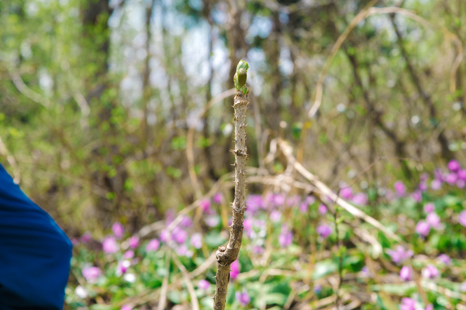 荒地でも育つのが特徴のタラの芽。山火事や土砂崩れで荒れた土地にもいち早く生えてくることから、白樺などと並んで「パイオニアツリー」と呼ばれるそう。土から顔を出したタラの芽は地下茎でつながっているため、1本見つければ近くに数本見つかるのも特徴。コシアブラのように、新芽をポキっと折って採ります。