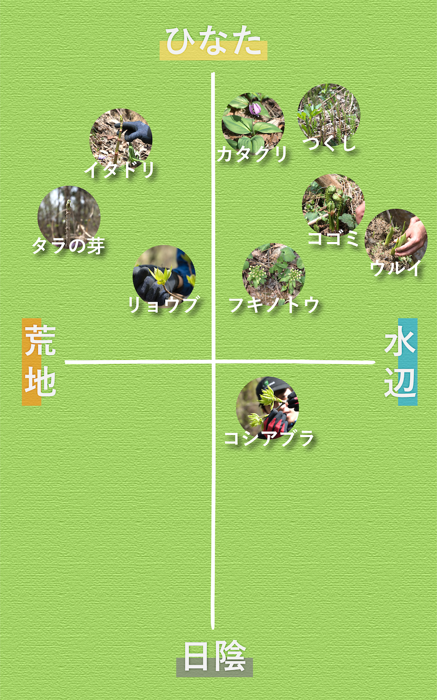 「そうですね。日の当たっている場所なら地面に生える山菜が豊富だったり、春に残雪のあるエリアには寒い時期に生える木の新芽が残っていたり、谷状の地形には水が集まりやすいから水辺を好む山菜があったり……」