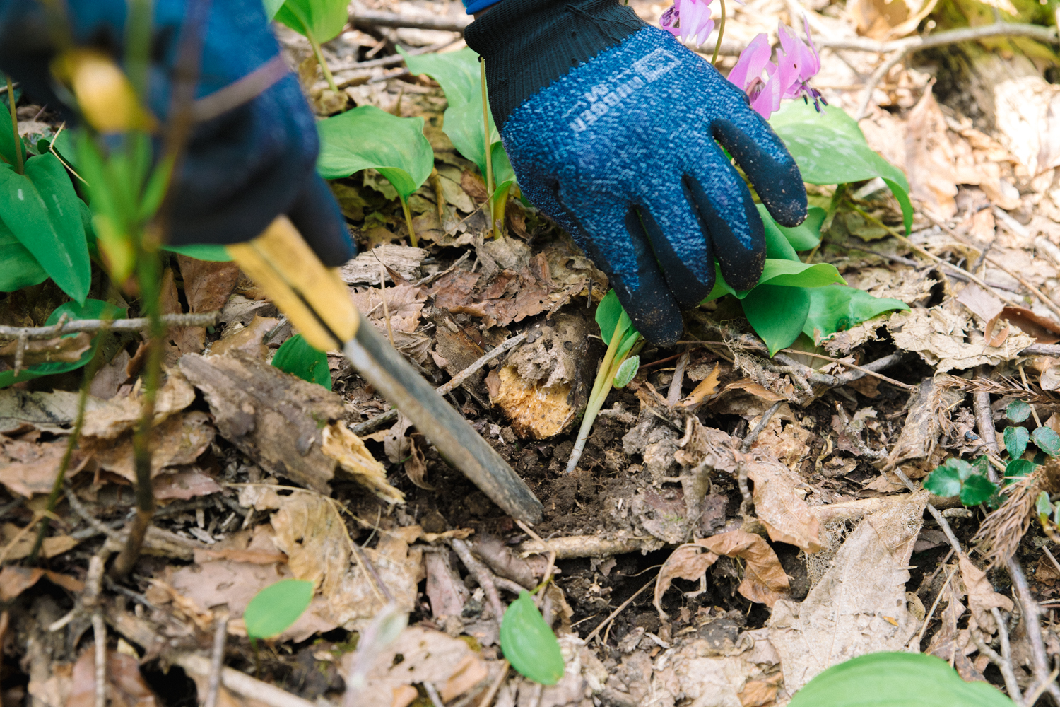 カタクリを取るには、「根掘り」と呼ばれるスコップとナイフを兼ねた道具を使います。球根を傷つけないよう、地中にある茎をカットするように根掘りを土に差し込みます。