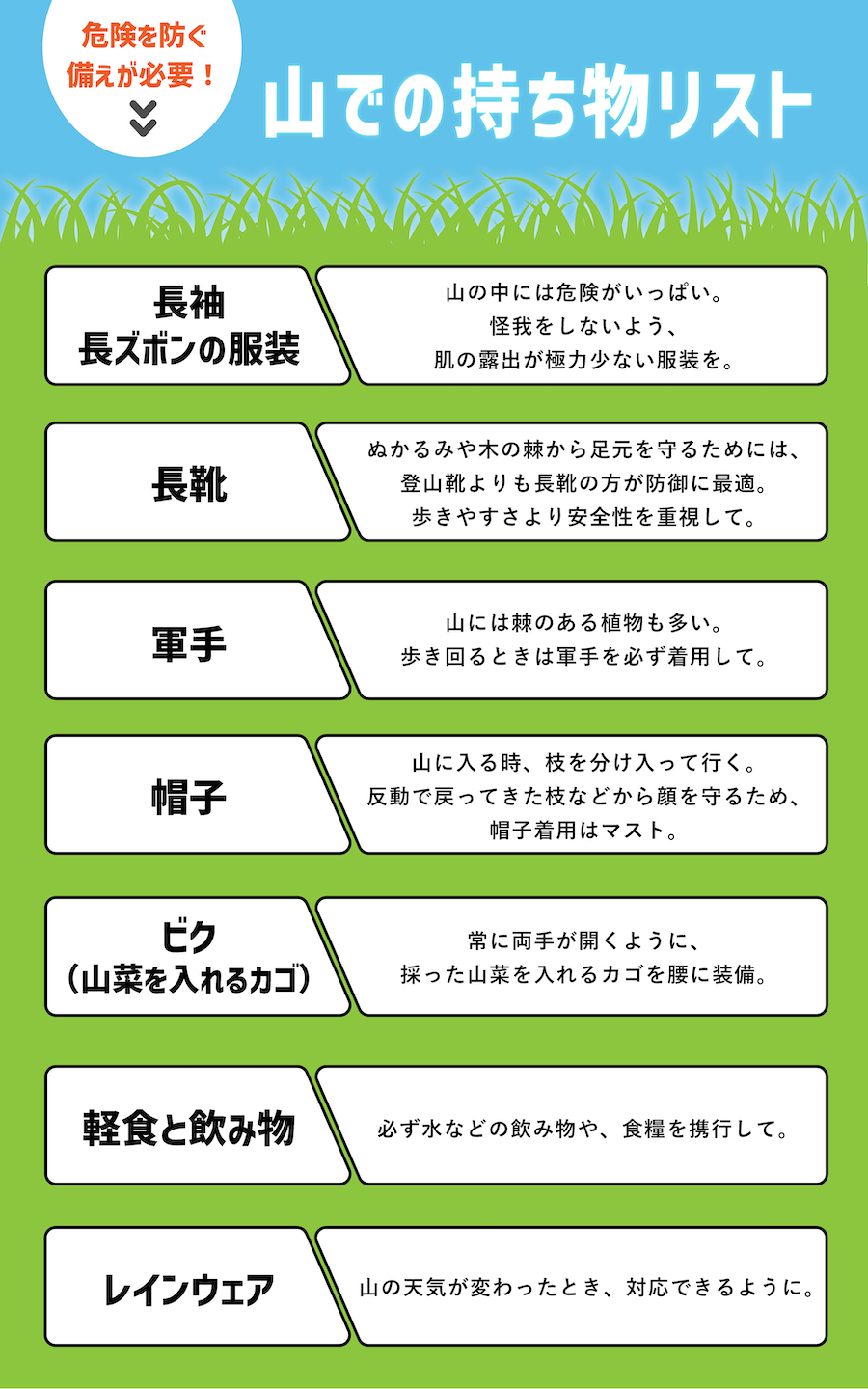 「今日は、必要な準備を一通り用意してきました。みなさん、これを装備して山に入ってくださいね」