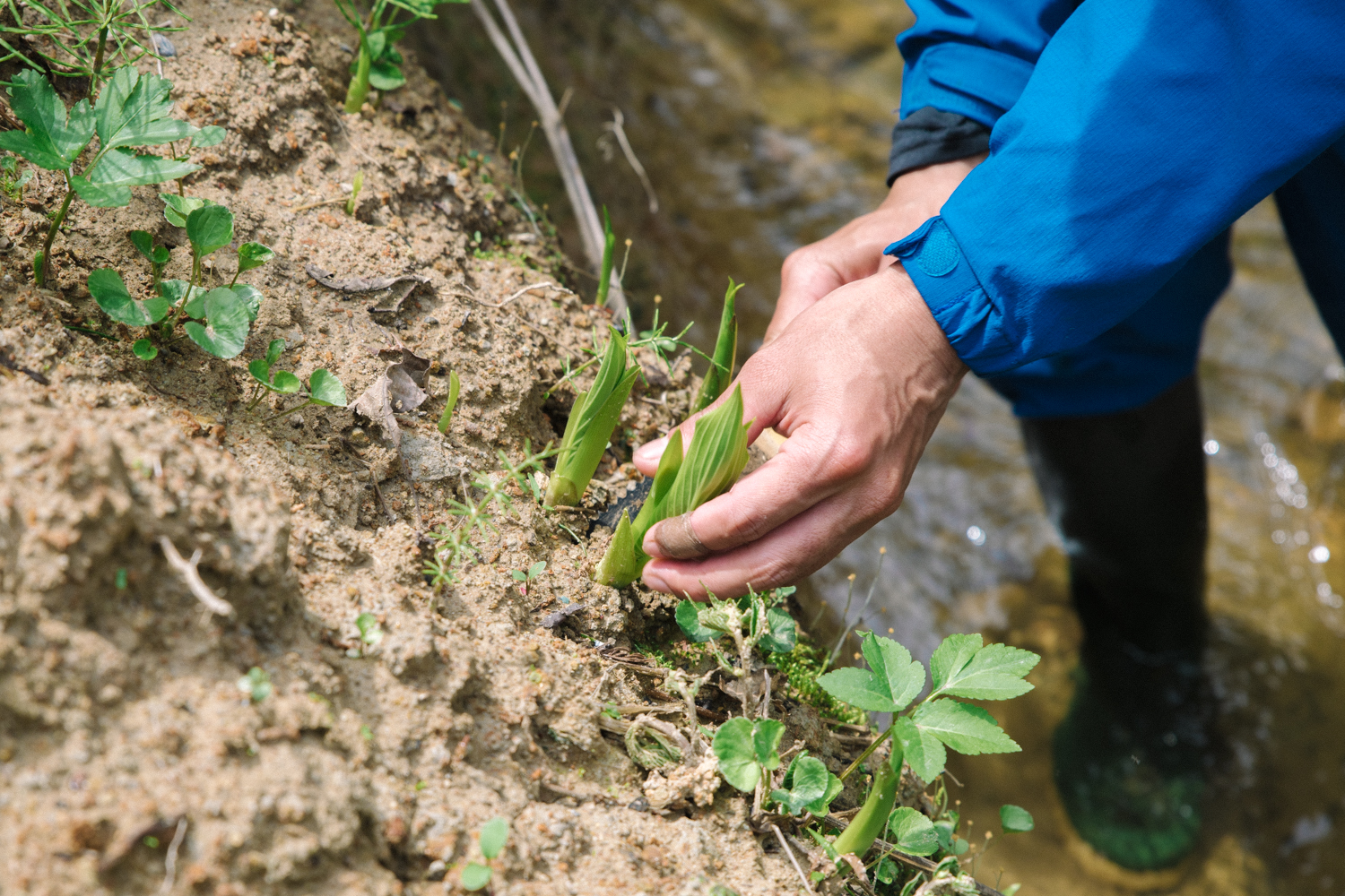 山を登ったり降りたりを繰り返してきた山菜採りツアー。沢を見つけるやいなや「入っていってみましょう! 水辺の山菜がありますよ!」と、遊さんに誘われるままにジャブジャブと沢のなかへ。
