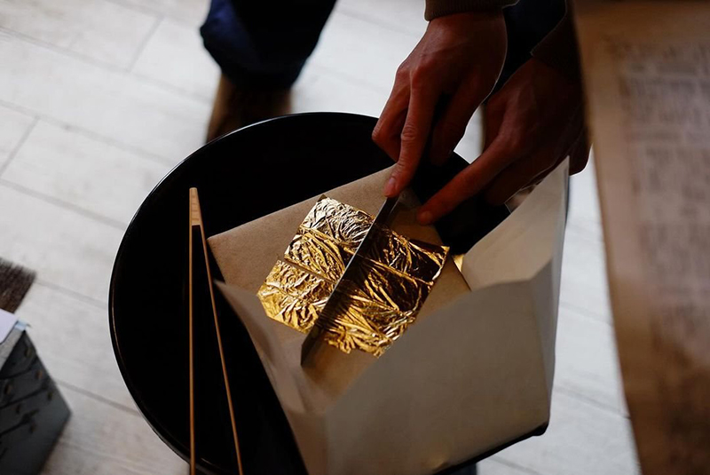 ギルディングに用いる金箔。これをガラスなどの表面に貼り付けて文字やグラフィックのレタリングを行う