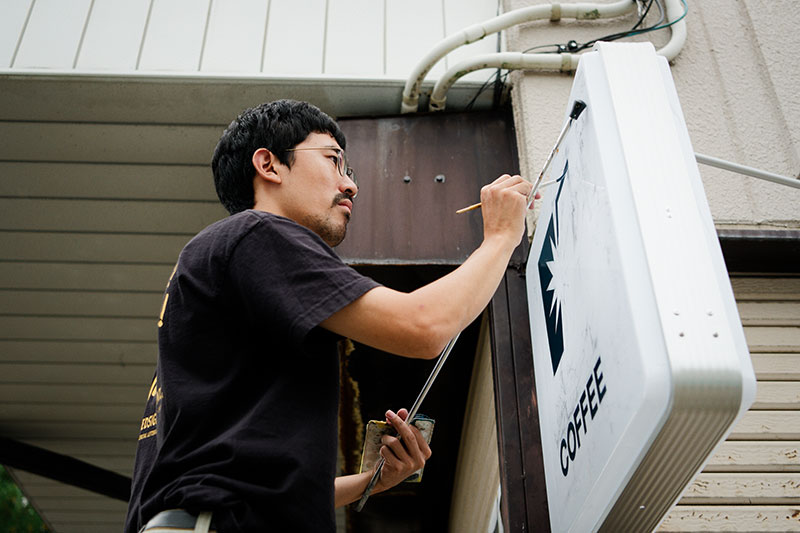 パカーンコーヒースタンドでは店先の看板以外にも、店内用のミニ看板やトイレなどのサインを担当。その場の会話からその場でデザインして施工する、師匠のジャック譲りのスタイルで書いていったそう