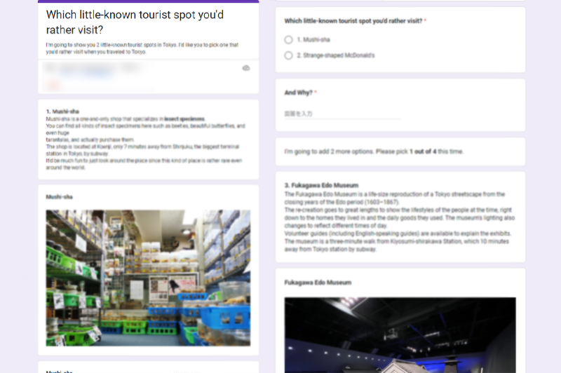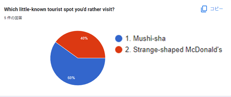 このようなGoogleフォームを作成し、「日本に旅行するとしたら、『むし社』『マクドナルド中野坂上店』どちらに行きたい?」と聞いてみました。