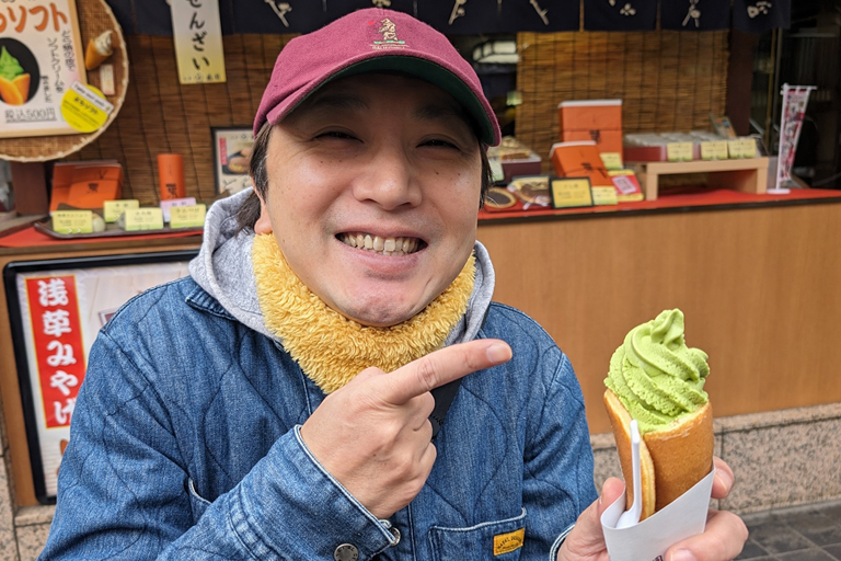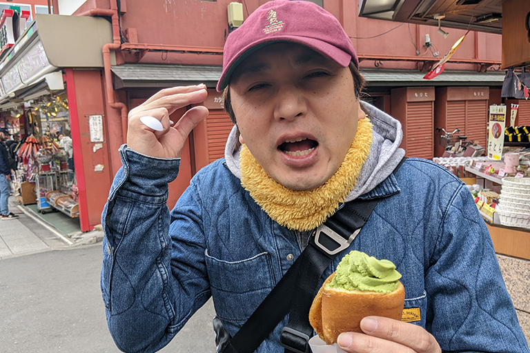 じゃあぼくは、コーンの部分がどら焼きの皮になったソフトクリーム「梅園 浅草本店」の「どらソフト抹茶味(400円)」を食べちゃいます。