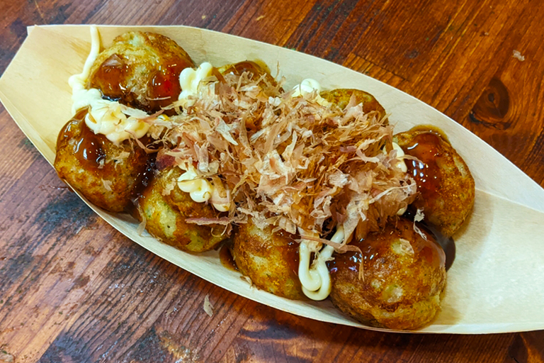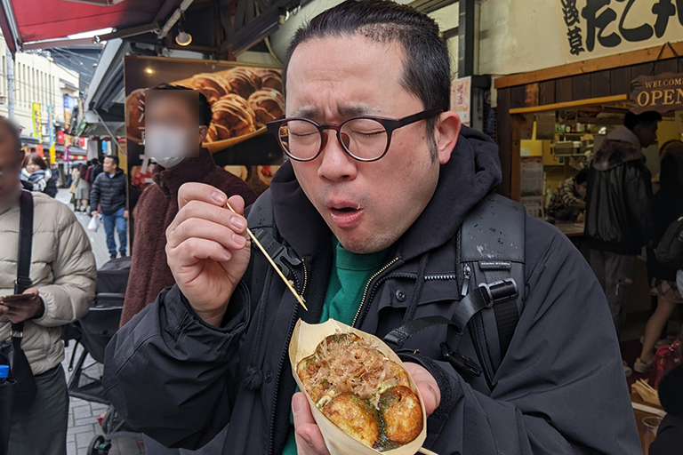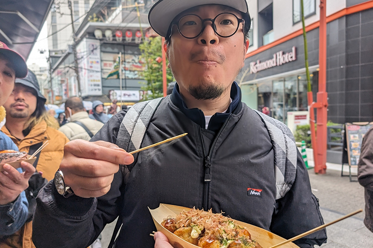 たこ焼き食ってるんですよ!「外はカリっ 中はとろ~り」の僕が好きなたこ焼きだ! 一人で30個食べたい。