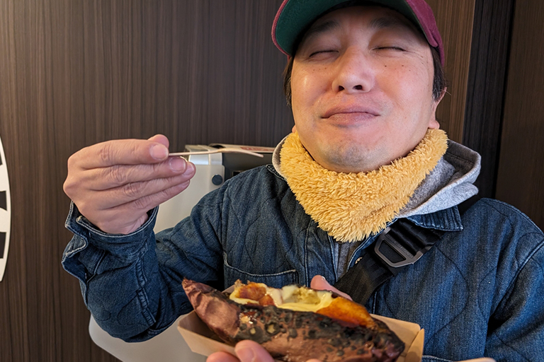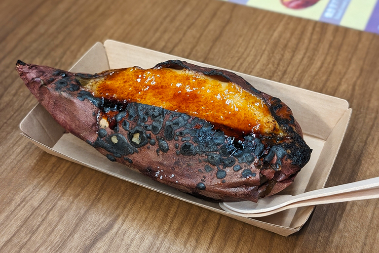 想定してるより3倍甘~~~い! もっちりネットリとした焼き芋に甘いカスタード、表面のパリッパリの焦がしカラメル……見た目のインパクトが満点すぎる。