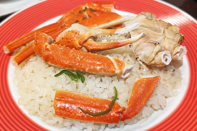そんなメヒコの名物といえばズワイガニの「カニピラフ」。今回はもちろんそれが入った「カニピラフスペシャルランチ」を注文しました。ちなみに上に乗っているカニは「殻付き」か「むき身」を選べます。せっかくフィンガーボウルがあるので、手がベチャベチャになろうが構わない!と思って殻付きを選びましたが、ハサミがあっても殻を剥くのは大変で、食事が冷めないうちに食べたいと焦りました。皆さんには「むき身」を選んでいただくことをおすすめします。