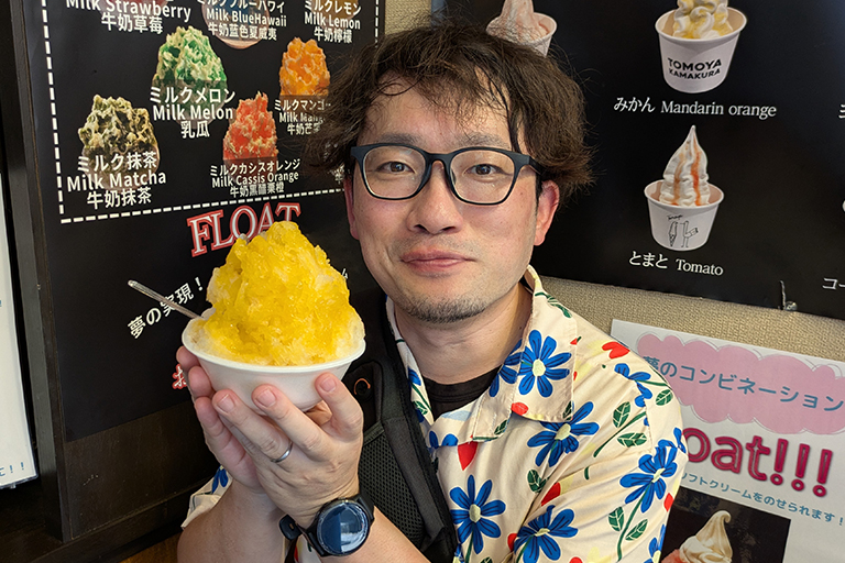 僕はもう暑さの限界なのでかき氷を食べます! 社員旅行でタイに行ってからマンゴーの魅力に取り憑かれたので、生マンゴーシロップをチョイス!