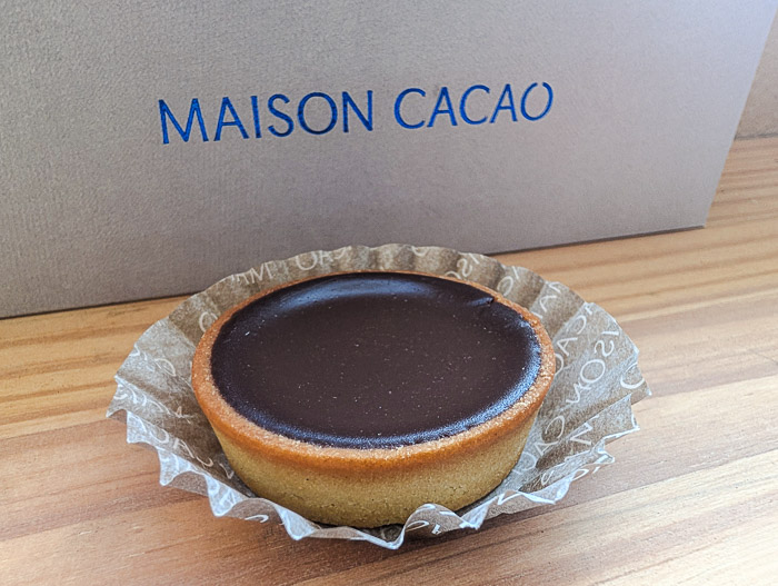 今回は、お土産で一番人気の「アロマ生チョコタルト」を家族4人分買いました。外が暑かったのでどこにも寄らず、急いで埼玉の自宅に帰宅。家の冷蔵庫で冷やして、食べ頃になったら撮影しようと思っていたのですが……夕方に見たら自分の分以外全て食べられていました。そのため素材として使える写真はコレ1枚だけです。