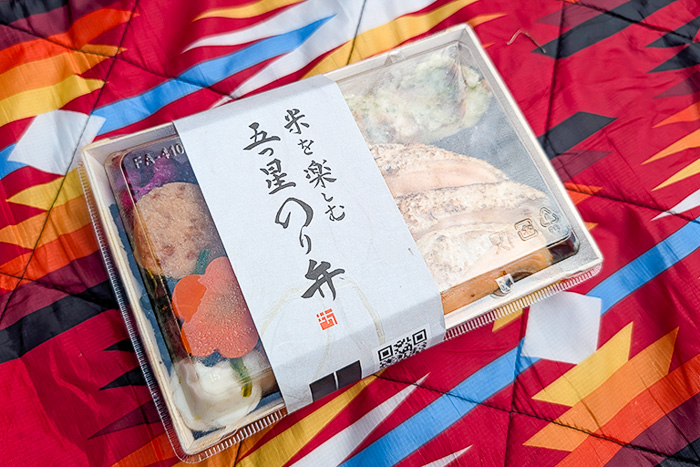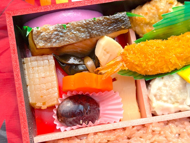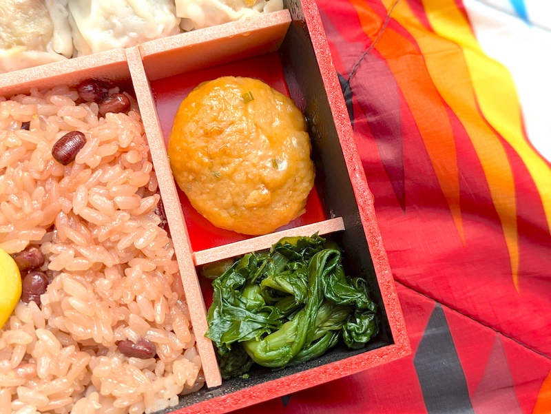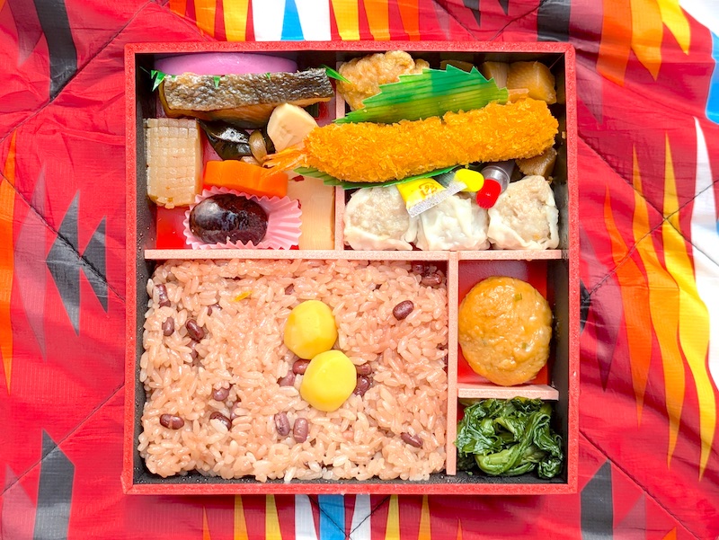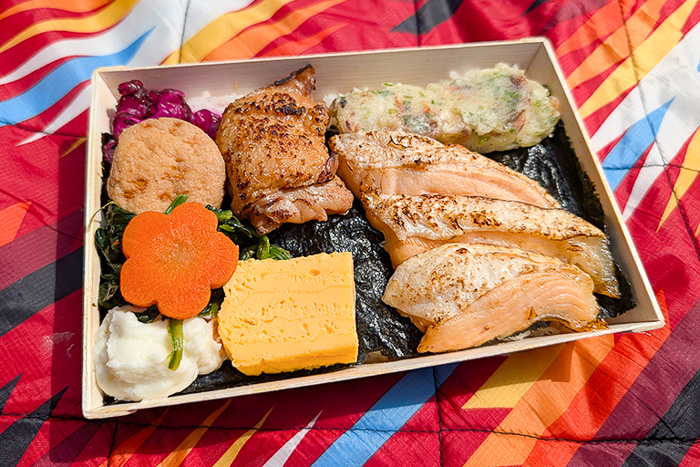 菜の花の醤油漬けがさりげなくいいアクセントになっているのも嬉しいポイントです。春の季節に屋外で食べると風情があって、全体を通して春のあたたかな空気とともに、おいしさと春の気配をしっかり楽しめるお弁当だと思います!!