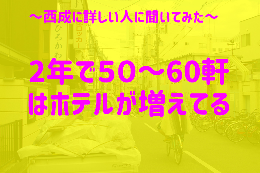 「前に友達に聞いた話だと、2018年から19年の2年間で、大阪市全体でホテルが106軒増えたらしいですね。いちばん多いのは西成で、この辺だけでも50、60は増えてるんじゃないかな」