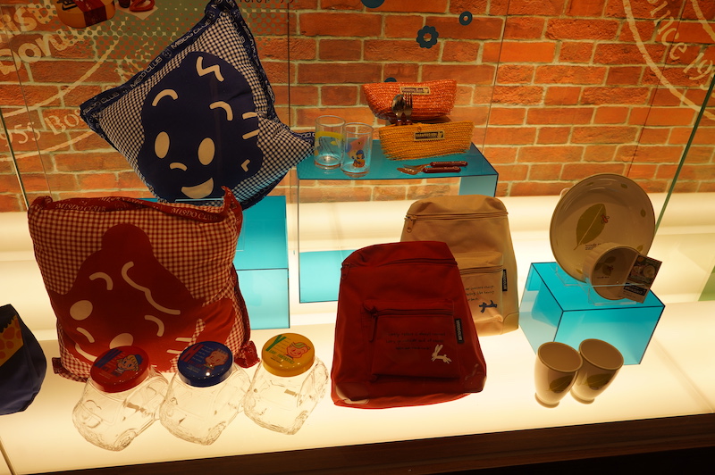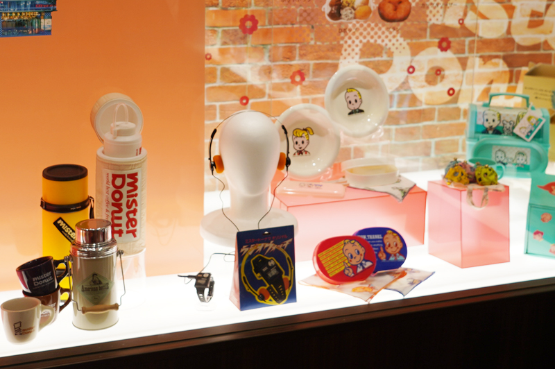 こちらがミスタードーナツが日本で創業した1971年から現在までのグッズの一部を展示したコーナーになります。年代によってコンセプトや展開グッズの傾向が違うのが見どころです