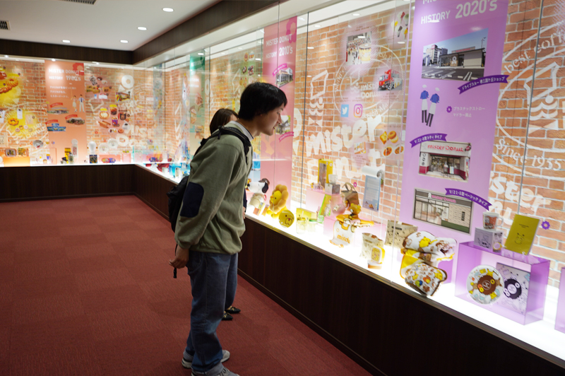 ミスドミュージアムは、ミスタードーナツのこれまでの歴史や取り組み、創業以来大切にしている想いを伝える施設です。歴代グッズの一部の展示や、今までオープンしたお店の写真展示などがあります