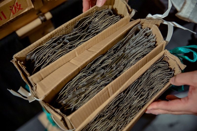 箱に入っている枚数がまったく違うでしょう。やっぱり、養殖の真昆布よりも、天然の真昆布の方が形も厚みもしっかりしていて、そのぶん味わいの深さもあるんです。