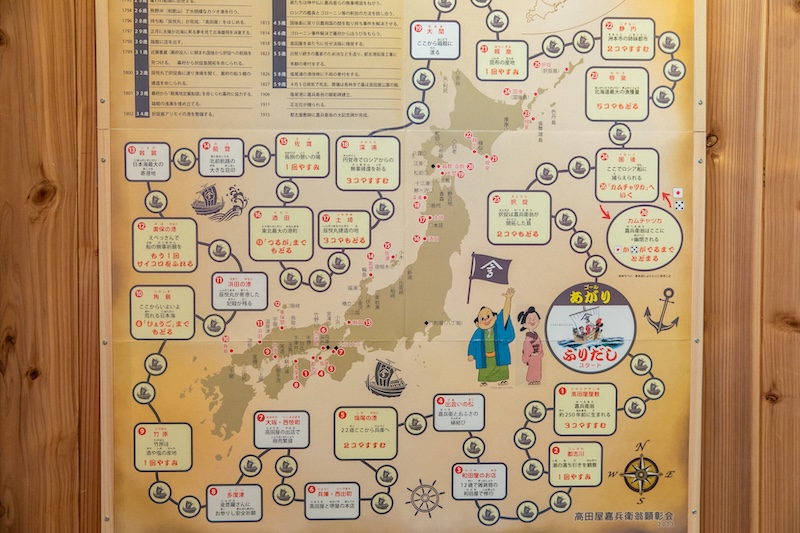 ミュージアム内に貼られている「嘉兵衛すごろく」。高田屋嘉兵衛とは北前船で蝦夷と本州を結び、日露関係の橋渡しもした淡路島出身の大商人。「箱館発展の恩人」と称されるほど、真昆布産地である道南地方に貢献した人物なんです!(制作:淡路島の「高田屋嘉兵衛翁顕彰会」)