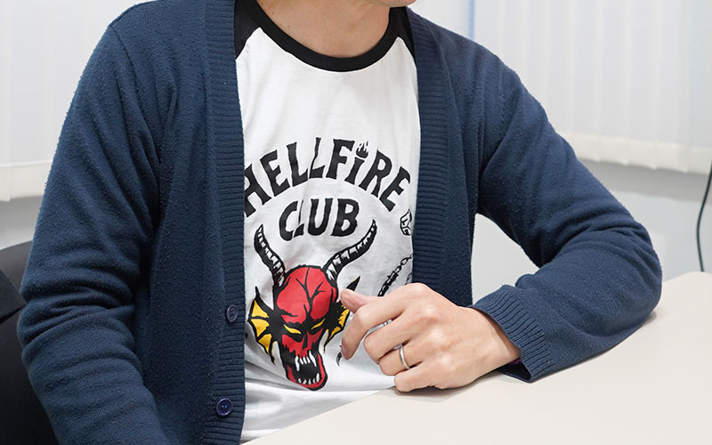直接的なグッズじゃないんですが、オモコロチャンネル(※バーグハンバーグバーグ運営のyoutubeチャンネル)のこのTシャツ、発注する時に「ストレンジャー・シングスのアートワーク風にしたい」っていう方向性を決めてイラストレーターさんにお願いしたんですよ