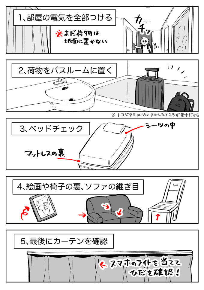 部屋が暗いと、人間を感知したトコジラミが天井から「ポタッ……」と降ってくる可能性があるので、部屋に入ったら真っ先に電気をつけよう!(トコジラミは光を嫌い、薄暗い場所に逃げ隠れるため)