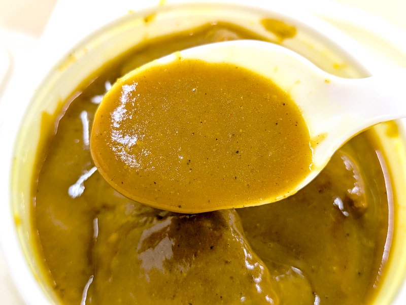 欧風カレーの味は中辛で、コク深い玉ねぎの甘みとスパイスの旨みが広がった後にじんわりと香辛料の辛さが伝わるうまさ。色々なカレーを食べてきたけど、オーベルジーヌの甘くてスパイシーな味わいは唯一無二なので、病みつきになる理由もわかる。