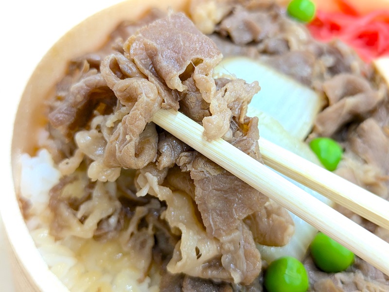 「牛肉弁当」は、選び抜かれた国産黒毛和牛を秘伝の割り下で丁寧に煮上げ、ふっくらとしたご飯の上にたっぷり乗せた人気のお弁当。