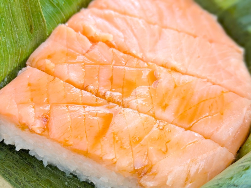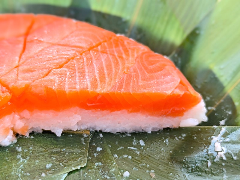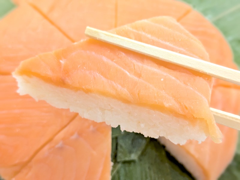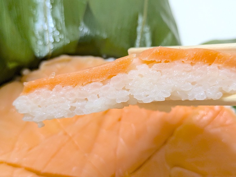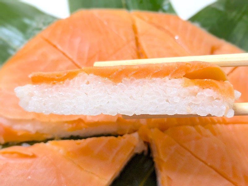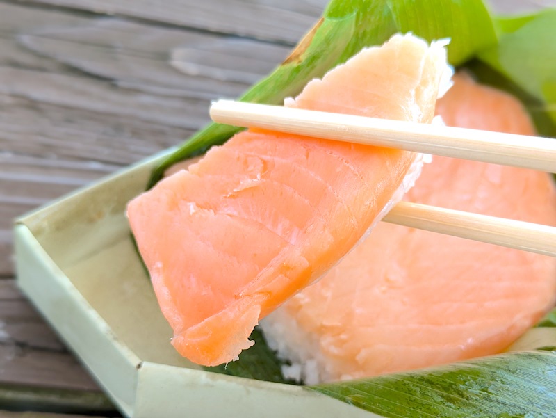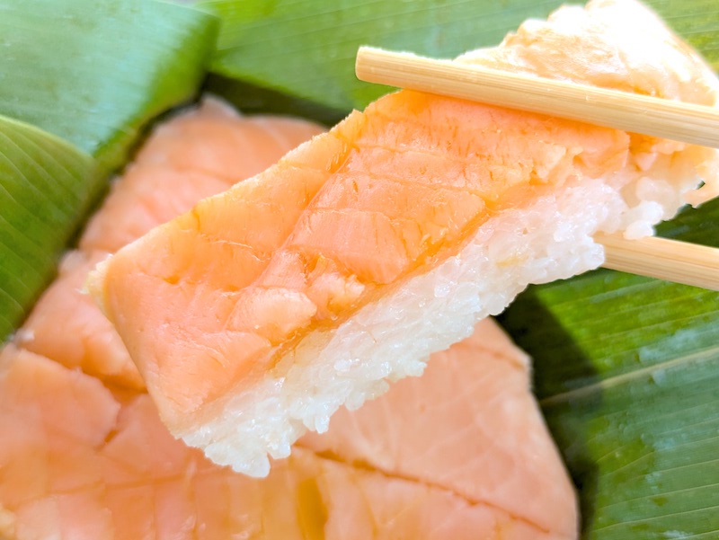 ます寿司とは一味違ったサーモンの生に近い食感や柔らかさが特徴で、酢でしめているのにも関わらず肉厚で脂がのったサーモンの旨みが口の中で上品に広がるのもたまらなく美味しい。