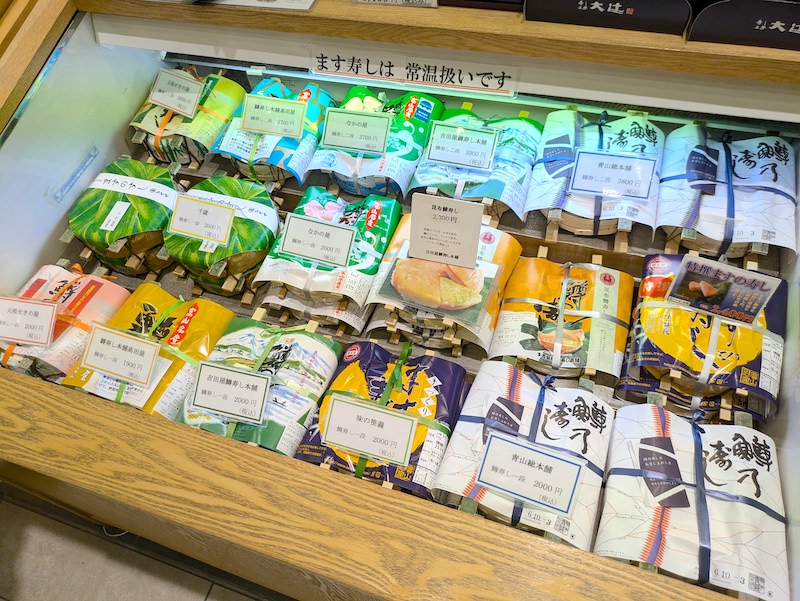 富山駅から歩いてすぐの場所にある「鱒寿し」専門店には、価格帯に応じてお手頃なものから高級感あふれるものまで、さまざまな種類のます寿司がずらり!