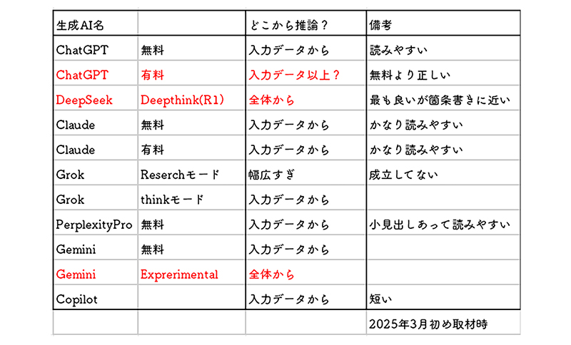 「全体を通してだとDeepSeekが一番よくまとまっているなという印象を持ちました。入力したデータに書いてないことも出してくれている。Web上のいろんな情報を反映させてるんでしょうね。