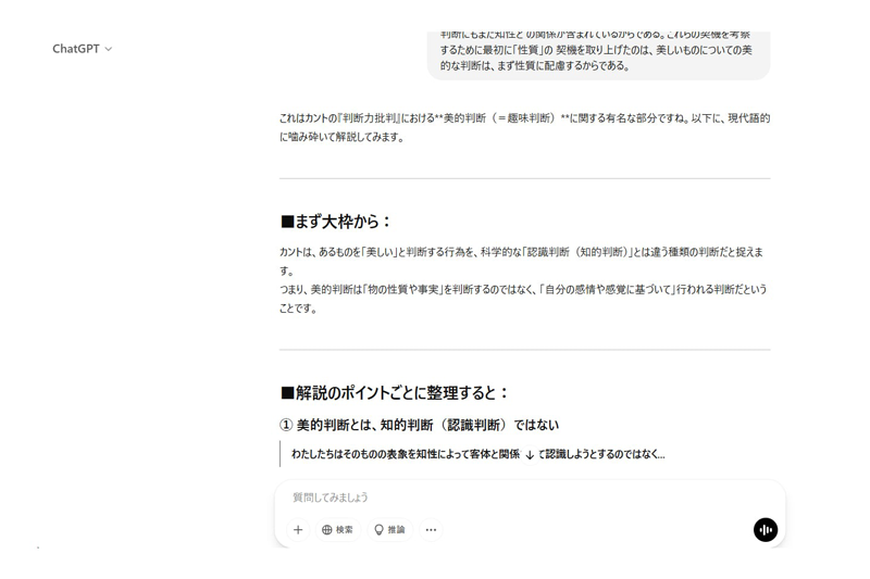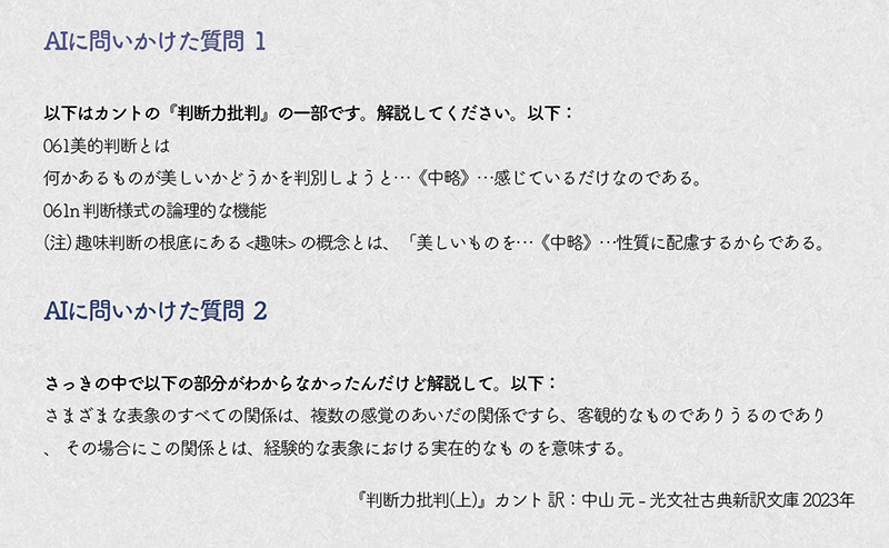 「さあ、そんな訓練をしないでもいけるのかと、実際に『判断力批判』をAIに解説してもらいます。本編の冒頭をテキストデータで入力して『解説して』とお願いしたのが質問1。その中でも特に意味のわからなかった一文を解説してもらったのが質問2です」