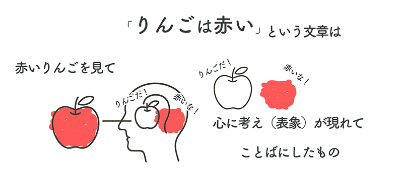 「例えば『りんごは赤い』って文章があります。『りんご』や『赤い』という考え(表象)が心の中にあってそれをくっつけて(関係)言葉にしてる」