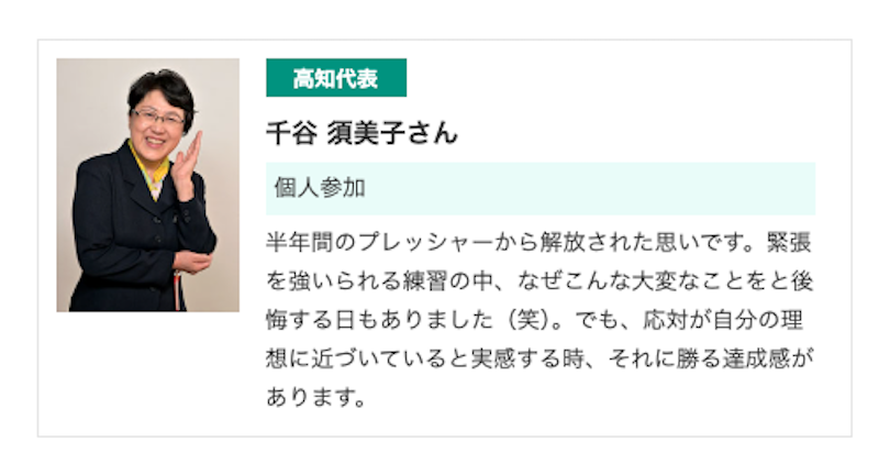 高知県の代表であり個人で出場する千谷須美子さんにお話をうかがいました